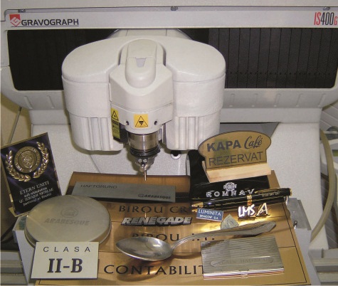 - Gravura plana si pe rotund. - 360° pe obiecte cilindrice. - Gravura pe obiecte curbate, conice. - Placi birouri, apartamente, industriale, de avertizare, signalectica, HORECA, etc. - Plachete omagiale, funerare, cupe, medalii, trofee, bijuterii, ceasuri, brelocuri, telefoane, scrumiere, tacamuri (furculite, linguri, cutite), casete, insigne, pins-uri, ecusoane, cablaje, elemente de bricolaj - tunning si obiecte promotionale adecvate acestui procedeu de imprimare. |