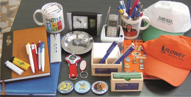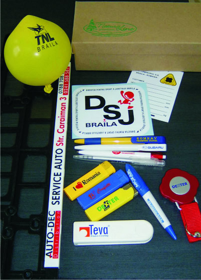- Obiecte promotionale: pixuri, brichete, brelocuri, insigne, pin-suri,